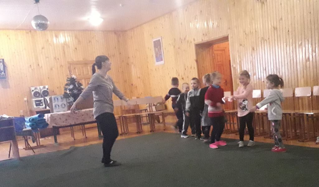 Розпочалася подорож до зимового лісу під пісню «Джингл белс». Подорожуючи, діти відвідали різних лісових звірів. Гімнастику робили разом з вовком, хоровод водили з лисичкою, дихальну вправу з ведмедиком, з мишкою створили «паперовий оркестр», а на «автобусі» поїхали додому.