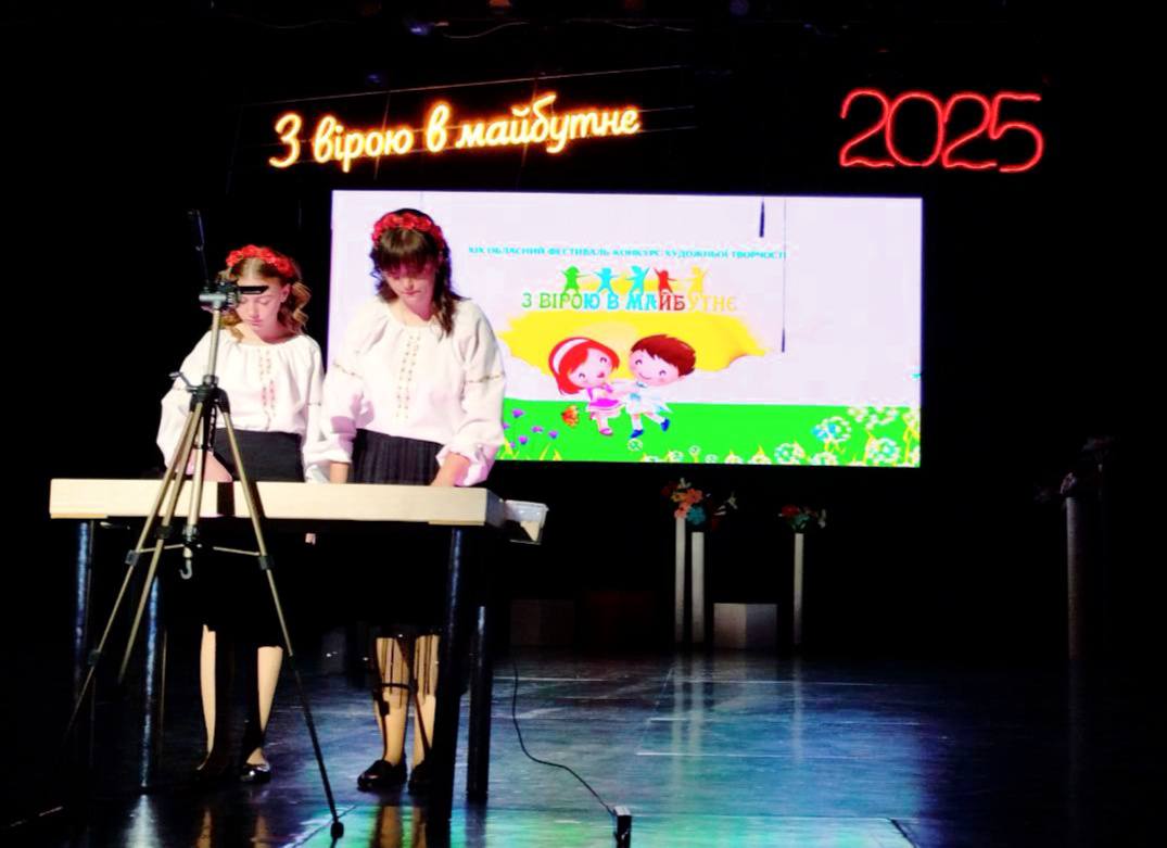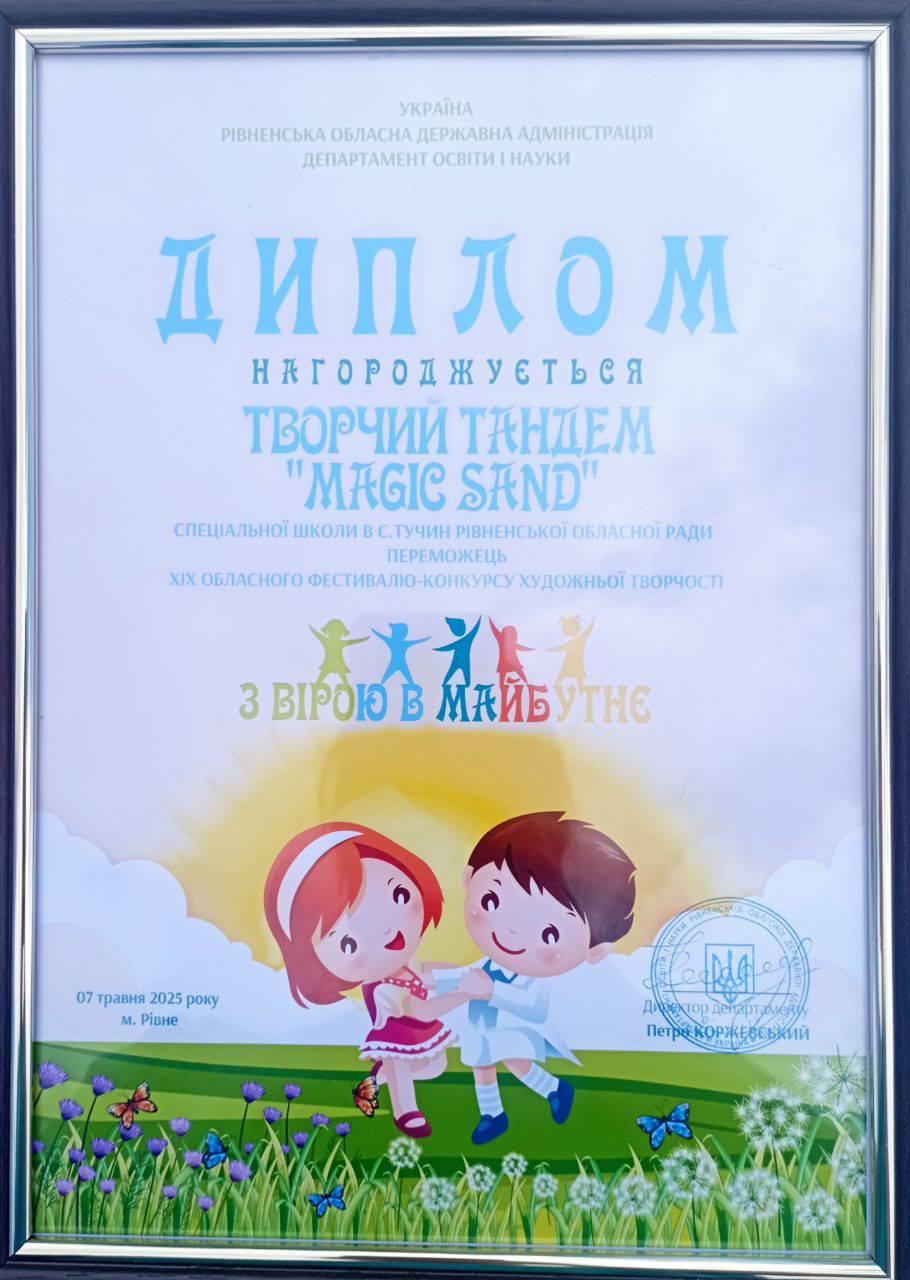 Спеціальна школа в с. Тучин Рівненської обласної ради представляла учениця 6 класу Чумак Софія разом із керівником гуртка “Пісочна анімація” Альона Журомська Жданюк. Вони презентували зворушливу композицію “Діти України”, яка стала щирим посланням миру, надії та любові до рідної землі.